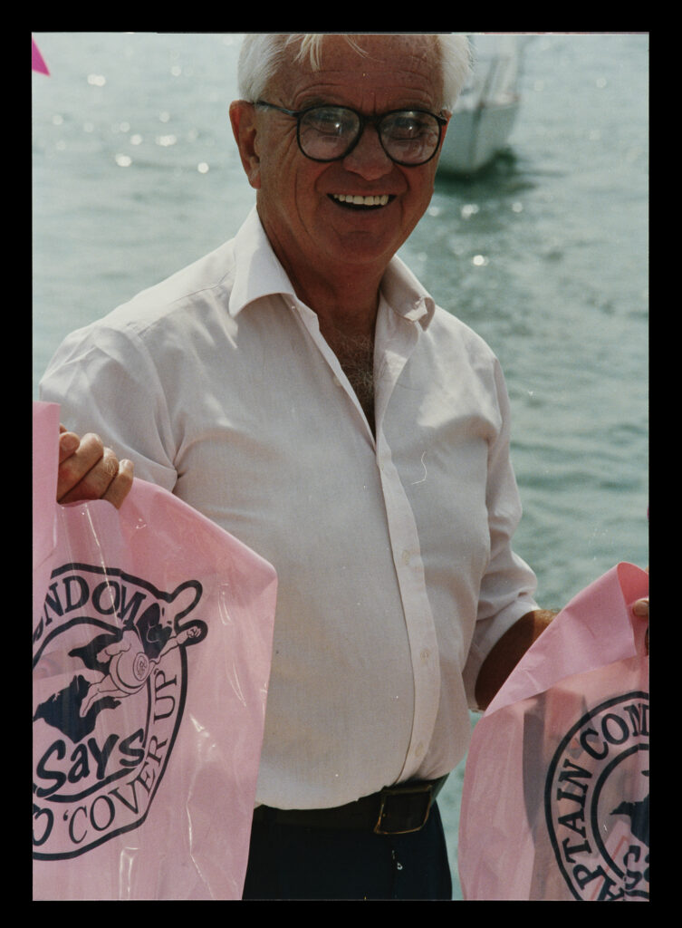 The carrier bag was used during the campaign’s public launch at ‘Cowes Week’, a major international sailing event that takes place on the island. As seen in the below photographs, ‘holiday health packs’ containing promotional materials such as hats and badges, educational leaflets and condoms were given out to yachts during the event. When criticised by staff on the marina, campaigners pointed out that the island experienced an annual high birth rate nine months after Cowes Week.