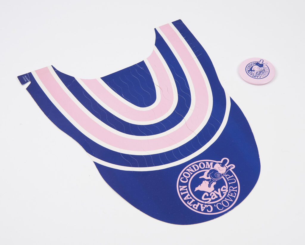 By coincidence, Captain Condom employed the same approach: it used humour and bright colours to make the subject more accessible, in particular to young people – the logo itself was created in collaboration with local students. The promotional materials included foldable paper hats, carrier bags, beer mats, stickers, leaflets, posters, badges and mugs. They all had the same pink and blue logo with the slogan ‘Captain Condom says cover up!’