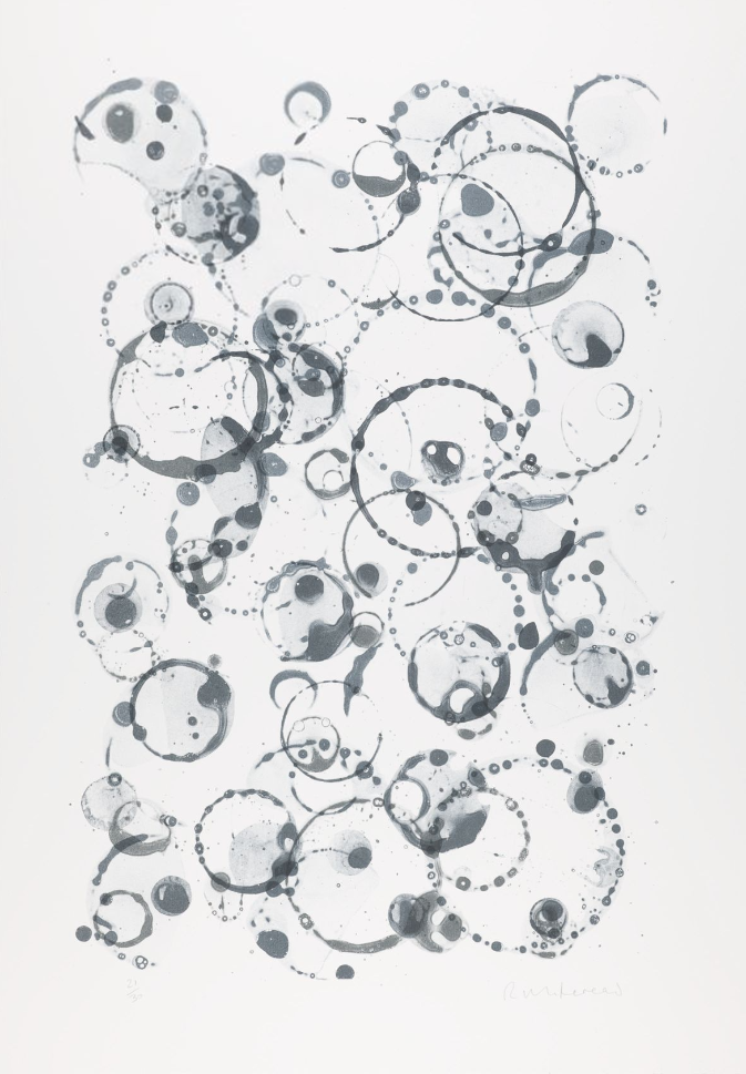 Untitled (Bubble) by Rachel Whiteread DBE is more ambiguous and subdued. The print features overlapping circles in different sizes and shades of grey, sometimes faint, sometimes inky blots. It creates a dense abstract pattern.