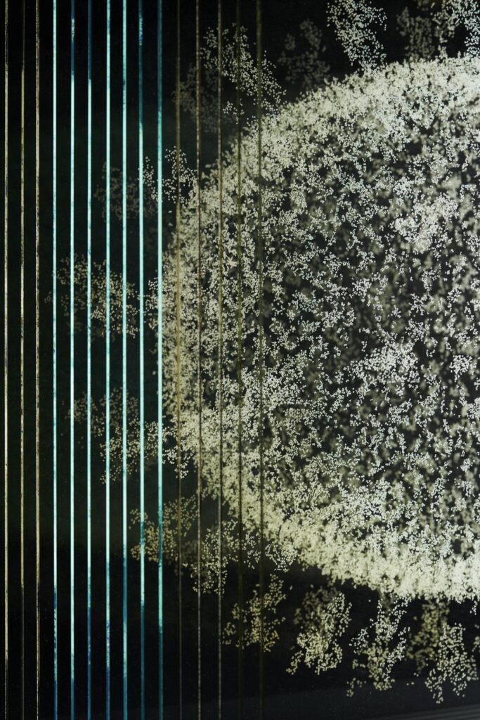 To reconstruct its image, she collaborated with computer scientist and bioinformatics Professor Dmitry Korkin at the Worcester Polytechnic Institute in Massachusetts who was modelling the virus and its deadly spikes. Palmer then engraved by hand the image on 28 sheets of glass. Once lit, the work reveals a glowing three-dimensional virus which appears to float. It’s at once beautiful and threatening.