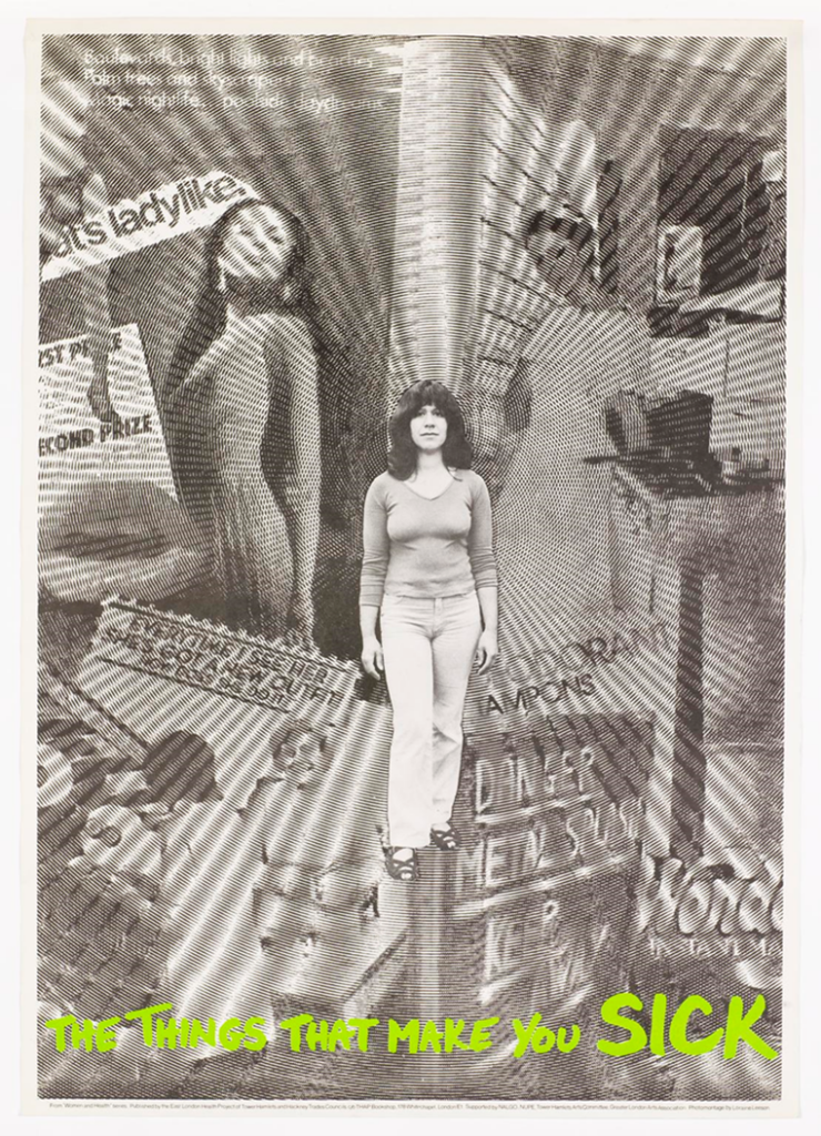 This poster features an eclectic range of images: lips, a woman in a kitchen, advertisements for ‘deodorant tampons’, a danger sign. What was the inspiration behind this poster and how does it link to health?