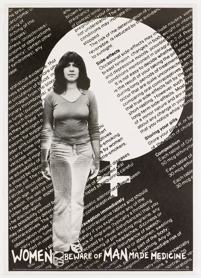This poster, whose background features the side effects section of a patient information leaflet for the contraceptive pill, tells women to ‘beware of man-made medicine.’ What concerns did women have about the pill at the time and has the perception of the pill change since its introduction in the 1960s?