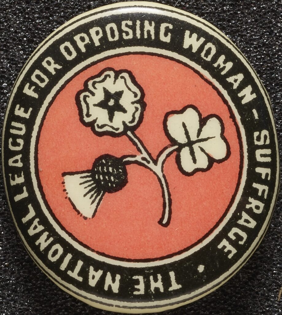 This lapel badge illustrates an individual’s support for The National League for Opposing Woman Suffrage (NLOWS) which was formed in 1910 upon the merging of the Women’s National Anti-Suffrage League and the Men’s League for Opposing Women’s Suffrage.