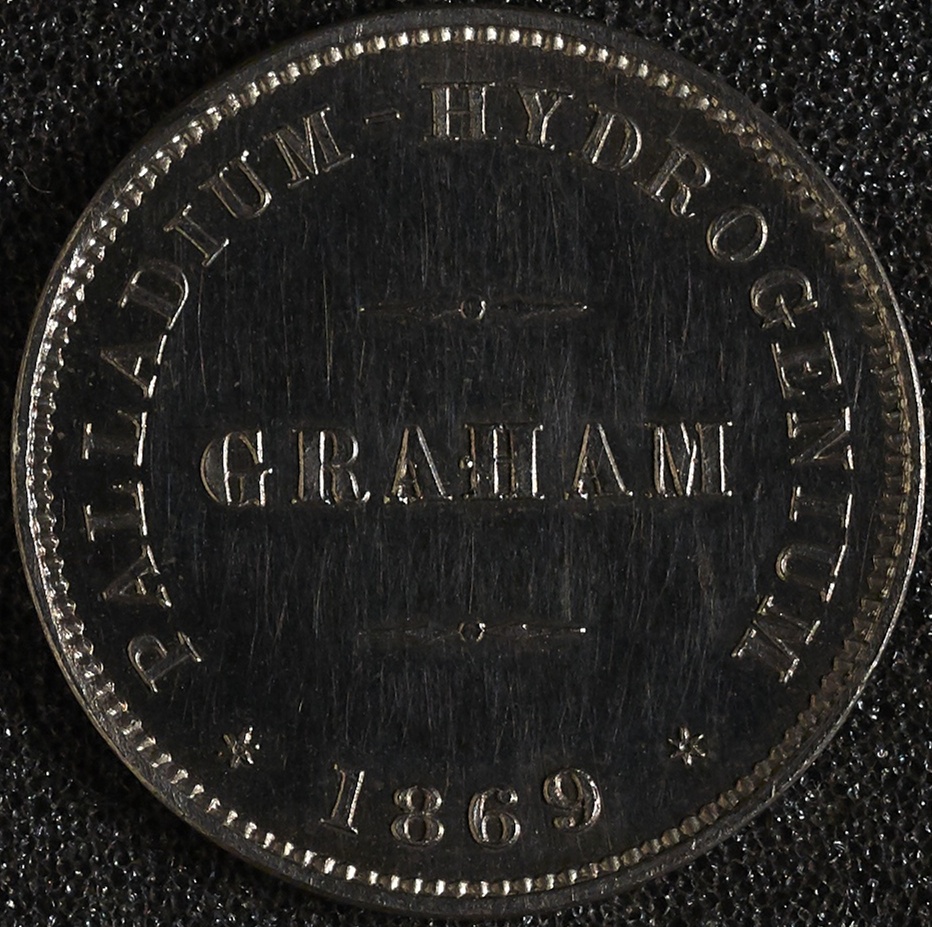 The coin is a manifestation of Graham’s discovery that hydrogen readily penetrated the crystal lattices of certain metals, a process he called ‘occlusion’. Iron, platinum and especially palladium are affected. He supposed that hydrogen gas was the vapour of a very volatile metal, hydrogenium, which formed an alloy with palladium. This coin was struck with this supposed alloy, which contains 147 u or 900 volumes of hydrogen.