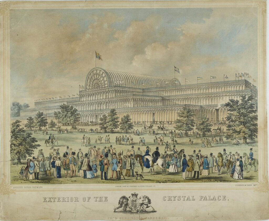 This illustration shows the building in its original home of Hyde Park. However, after the exhibition closed, the building was taken down and reconstructed in Sydenham Hill. Its new location was subsequently named Crystal Palace and it stood there for another 80 years before burning down in 1936.