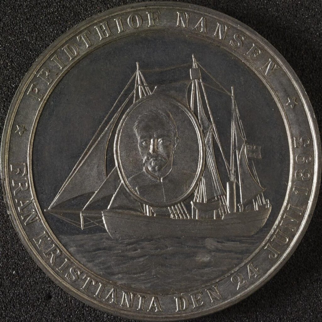 This medal marked two individual polar expeditions that reached the North Pole in the 1890s. One was undertaken by Norwegian explorer Fridtjof Nansen, who planned to reach the North Pole by harnessing the natural current of the Arctic Ocean. The expedition lasted 3 years. The medal is inscribed with the date the expedition began – 24 June 1893 – as well as Nansen’s likeness in front of the ship that carried him and his crew, the Fram.