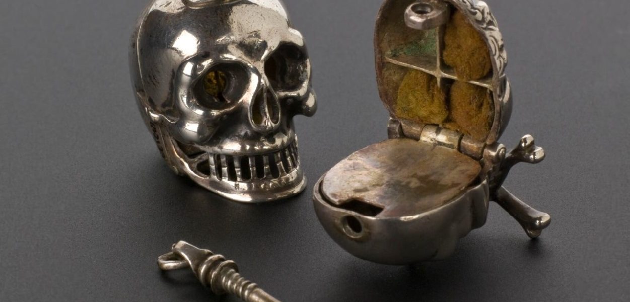In a few short weeks I have found: a tinder box made out of a crocodile’s tooth and another made out of a porcupine’s tail; antique apothecary scales with weights called Drams and Scruples; and my favourite so far, a silver vinaigrette (or perfume bottle) in the shape of a skull, with a stopper made of its neck vertebrae.