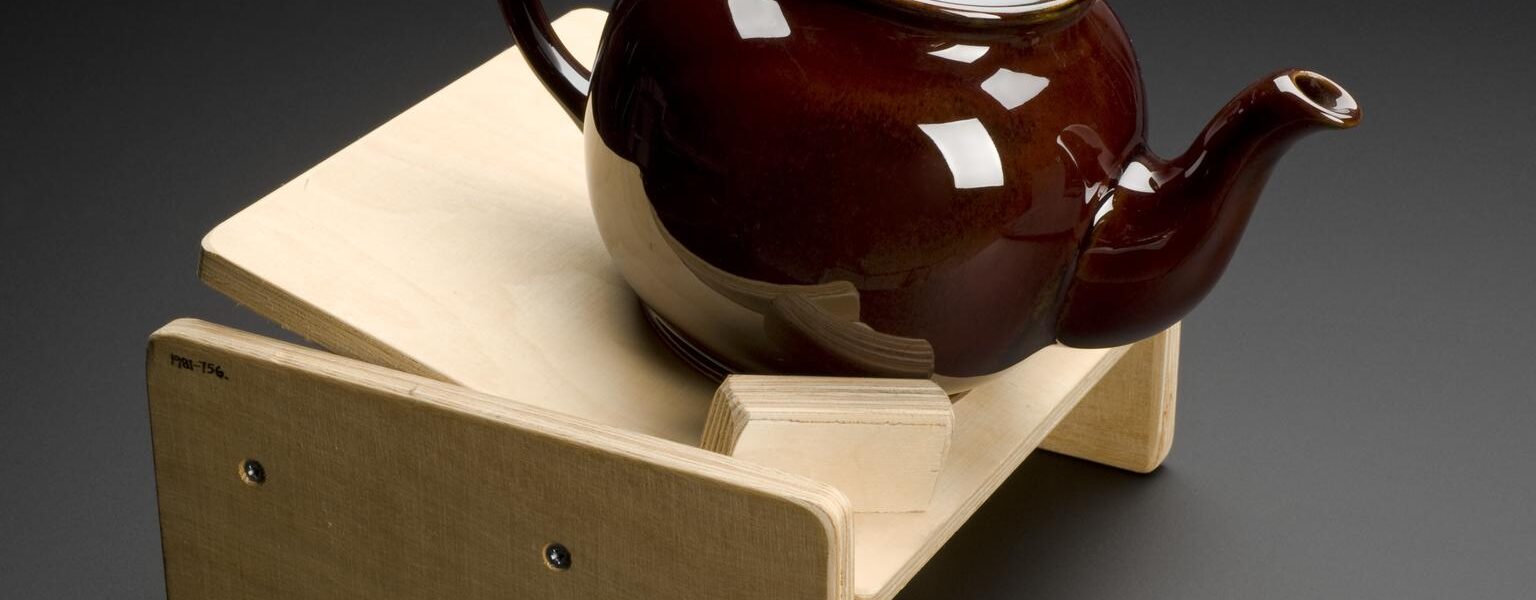 Stands such as this one were specifically designed to securely hold the pot and gently tilt it on a hinge towards a cup. As a result, users with stiff or painful joints can steadily pour tea themselves. It might also have been useful for people with tremors, such as those diagnosed with Parkinson’s disease.