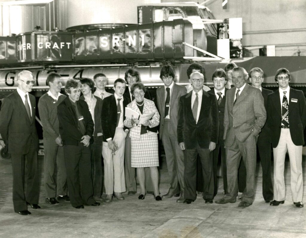 Upon agreement with the museum, work was undertaken in the 1970s by the British Hovercraft Corporation (BHC) to restore the hovercraft to suitable condition for static display. The photograph below was taken in 1980 when the SR-N1 was delivered back to the Science Museum Group’s site in Wroughton (now known as the Science and Innovation Park), where it still resides. The image shows some of the staff from BHC who worked on this project alongside others integral to the creation of the SR-N1.